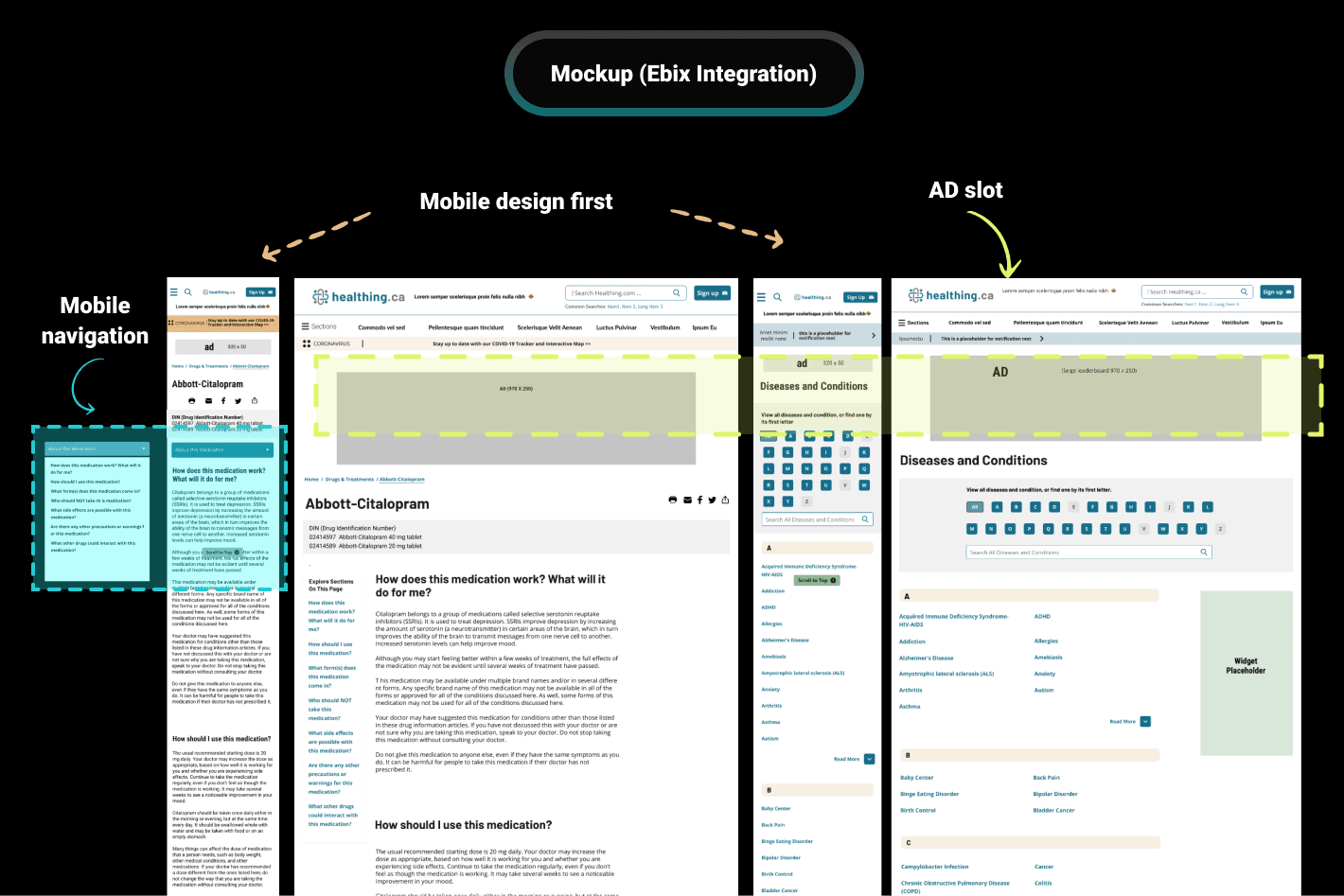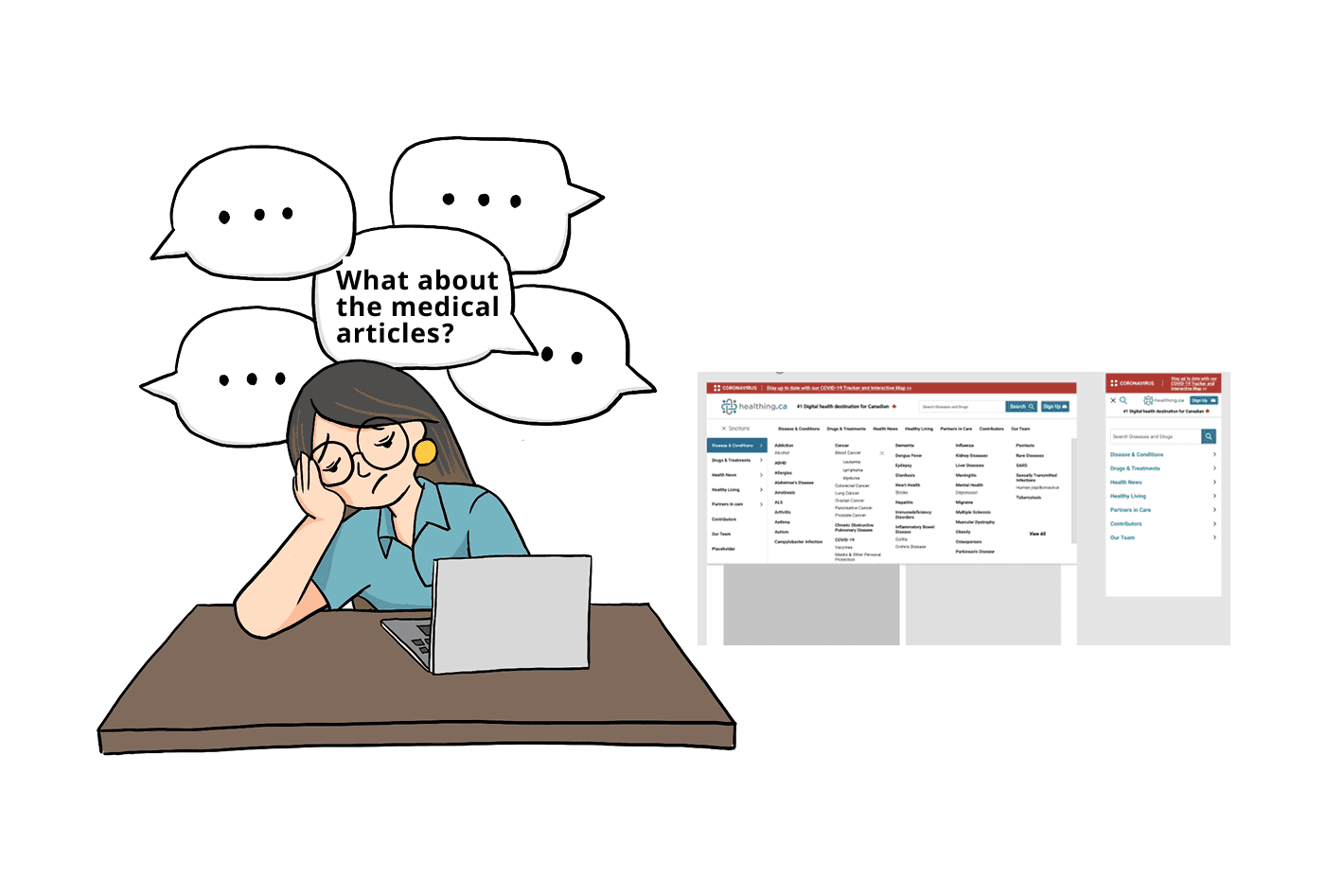 Canadians Seeking Health Information During the pandemic, our audience needed quick access to credible, trustworthy health news. They were navigating on mobile devices, looking for specific conditions or general wellness information, and needed to distinguish between editorial content and sponsored articles.